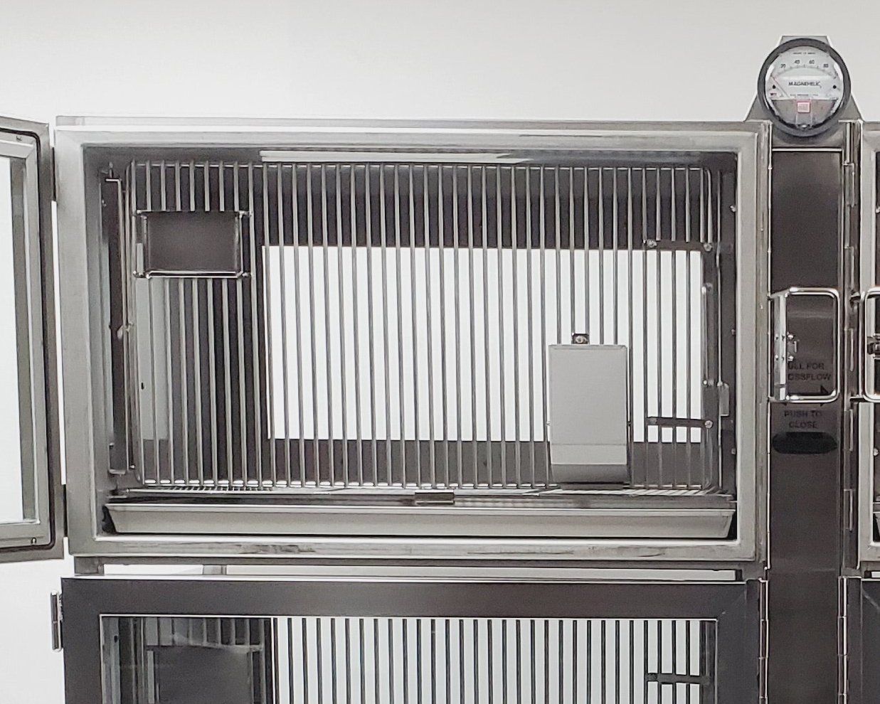 These cages provide safe long term housing for rabbits and ferrets. Available with cross flow valve for respiratory studies. Sealed cage units provide biocontainment, either with the optional Air Sentry HEPA filter unit, or, via house exhaust. Stainless Steel Cages are very durable and can be repeatedly autoclaved. Each compartment is 5.2 Sq. Ft.