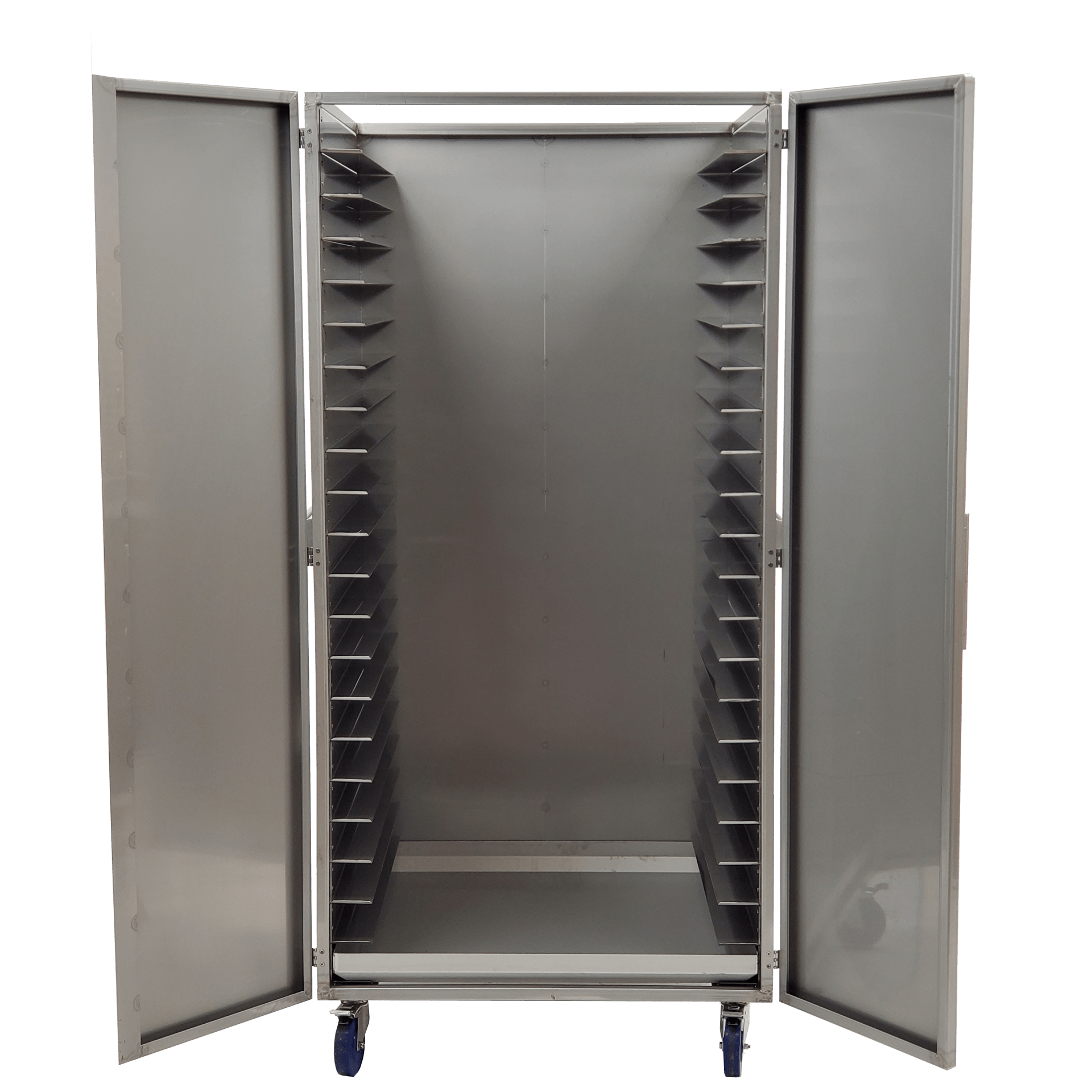 The enclosed pan carts hold your soiled pans in a horizontal position for safe travel to the washer and prevents spills and possible contamination of the facility. Carts are made in various models and styles and can be custom made for your pans. Built in push handles ensure technician safety during transportation.